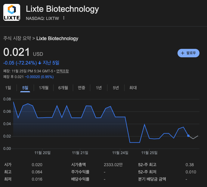 안녕하세요, Quantum Asset 블로그 독자 여러분!오늘은 특별히 주목받은 LIXTW (Lixte Biotechnology Holdings Inc. Call Warrant) 주식에 대해 이야기해보려 합니다. 어제 미국 시장에서 LIXTW 주가가 무려 111% 상승하며 $0.0211로 마감했습니다. 이는 본 주식 LIXT의 임상 호조와 바이오테크 M&A 기대가 투자자들의 매수 심리를 자극한 결과로 보입니다. 상승 이유부터 기업 분석, 그리고 앞으로의 전망까지 자세히 짚어보겠습니다. 모든 데이터는 Yahoo Finance와 신뢰할 수 있는 소스에서 확인한 최신 정보입니다. LIXTW 주식 상승 이유: 본 주식 임상 호조와 시장 기대LIXTW 주가는 이전 종가에서 하루 만에 $0.0211로 치솟았습니다..