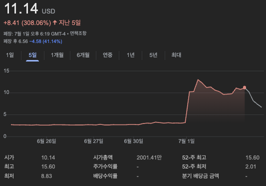 - 단기 전망: 현재 주가는 11.14달러로 과매수 상태(RSI 90 이상 추정)이며, 단기 조정 가능성이 높습니다. 애프터마켓에서 변동성이 지속되고 있으며, 8~9달러대에서 지지선을 형성할 가능성이 있습니다. 최근 262.87% 상승은 이익 실현 매물이 나올 수 있습니다.