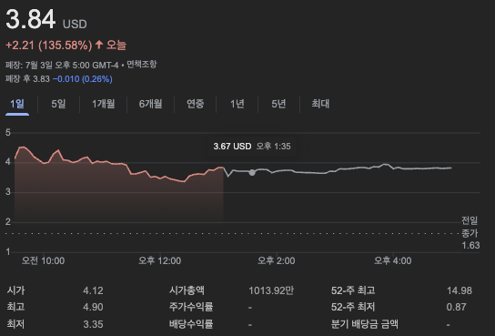 - 단기 전망: 현재 주가는 3.84달러로 과매수 상태(RSI 90 이상 추정)이며, 단기 조정 가능성이 높습니다. 2.5~3달러대에서 지지선을 형성할 가능성이 있으며, 최근 135.58% 상승은 이익 실현 매물이 나올 수 있습니다.