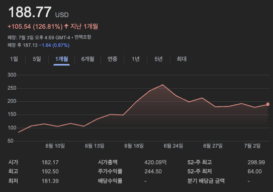 - 단기 전략: 현재 과열 상태이므로, 조정 후 150~180달러대에서 매수 기회를 노리세요. 목표 수익률 10~15%로 단기 트레이딩을 고려하며, 손절선은 20% 하락 시점(141.6달러)으로 설정하세요.