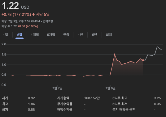 - 저가주 매력: 주식이 최근 저가대(52주 범위 0.35~3.25달러)에서 거래되던 점과 유통 주식 수가 제한적인 상황에서 수요가 급증하면서 가격이 급등한 것도 주요 요인으로 분석됩니다.
