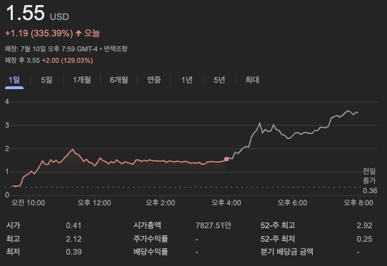 - 저가주 특성: 주식이 최근 저가대(52주 범위 0.25~1.55달러)에서 거래되던 점과 유통 주식 수가 제한적인 상황에서 수요가 급증하면서 가격이 급등한 것도 주요 요인으로 분석됩니다.