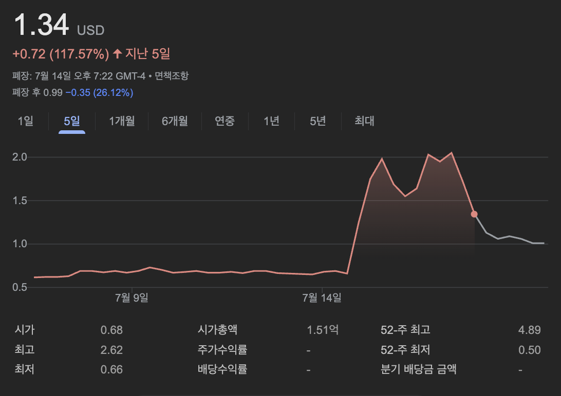 - 저가주 특성: 주식이 최근 저가대(52주 범위 0.73~4.89달러)에서 거래되던 점과 유통 주식 수가 제한적인 상황에서 수요가 급증하면서 가격이 급등한 것도 주요 요인으로 분석됩니다.