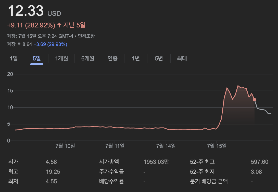- 저가주 특성: 주식이 최근 저가대(52주 범위 0.17~4.00달러)에서 거래되던 점과 유통 주식 수가 제한적이었던 상황에서 수요가 급증하면서 가격이 급등한 것도 주요 요인으로 분석됩니다.