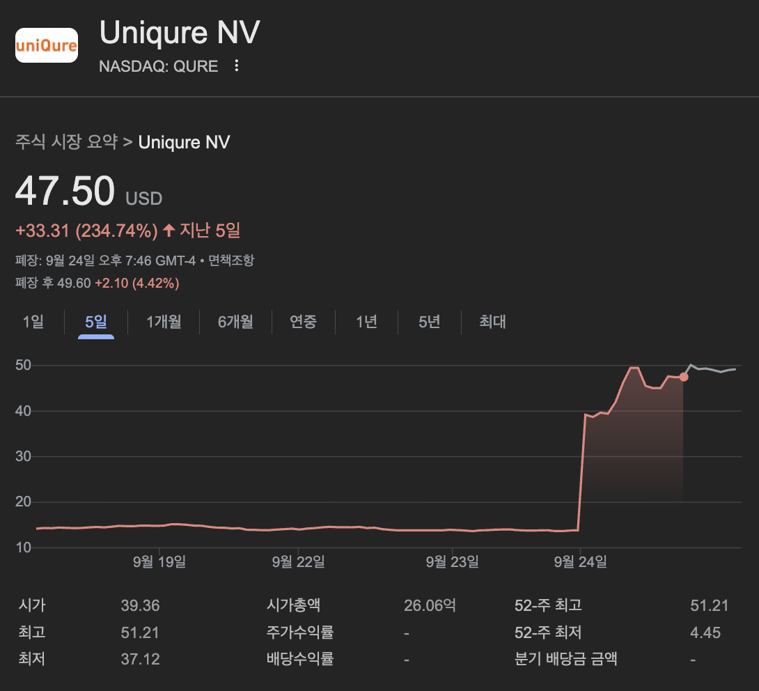 QURE 주식은 9월 24일(현지시간) 장중 247.73% 급등하며 47.5달러로 마감했습니다. 이는 프리마켓에서 이미 150% 이상 뛴 데 이어 거래 중 추가 랠리를 더한 결과로, 거래량이 평소 대비 20배 이상 폭증하며 '볼륨 익스플로전'을 기록했습니다.