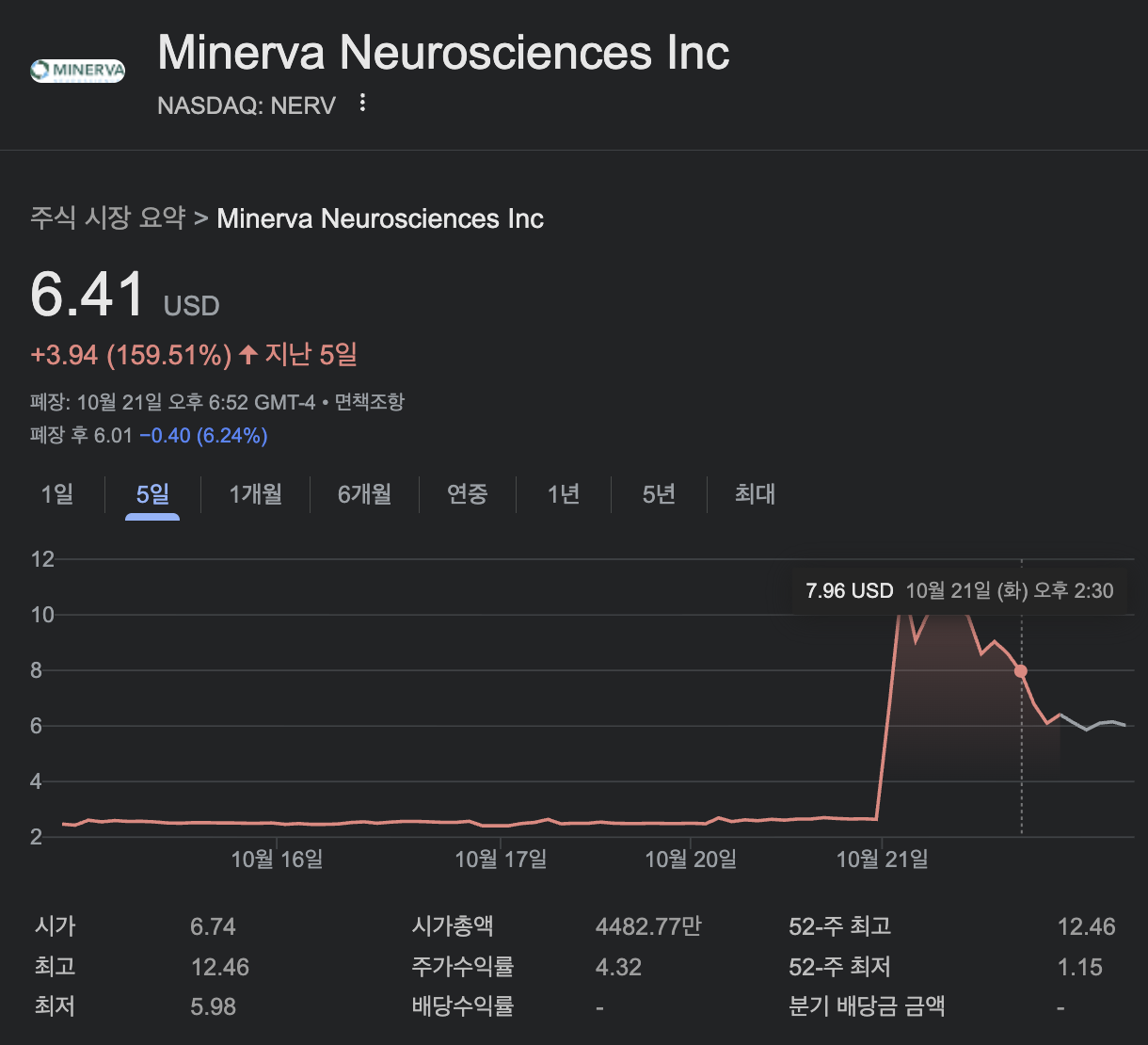 미네르바 뉴로사이언시스 (NERV) 주식은 10월 21일(현지시간) 장중 140.98% 상승하며 6.41달러로 마감했습니다. 이는 프리마켓에서 이미 100% 이상 뛴 데 이어 거래 중 추가 랠리를 더한 결과로, 거래량이 평소 대비 20배 이상 폭증하며 '볼륨 익스플로전'을 기록했습니다.