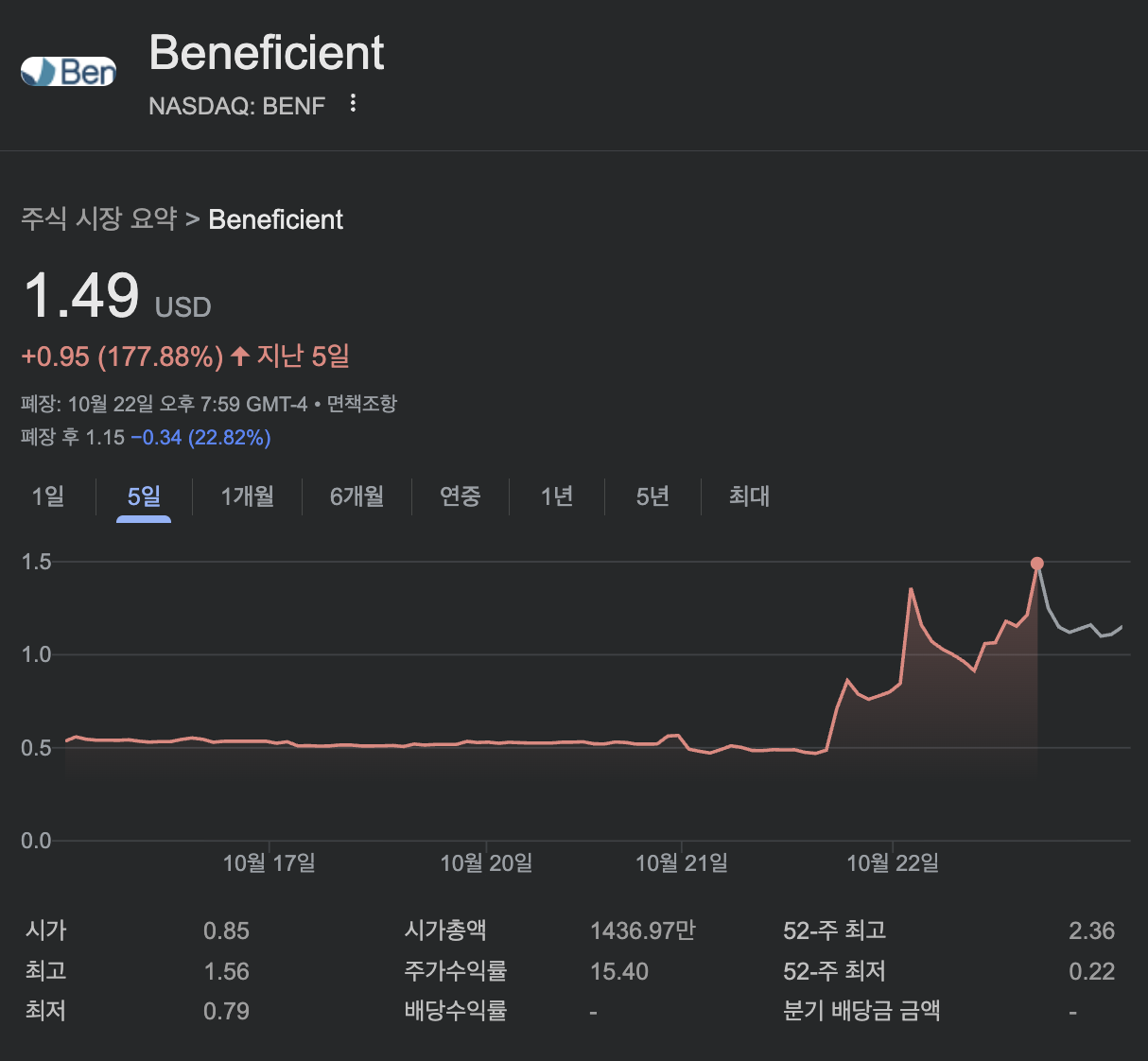 베네피선트 (BENF) 주식은 10월 21일(현지시간) 장중 205.95% 상승하며 1.49달러로 마감했습니다. 이는 프리마켓에서 이미 100% 이상 뛴 데 이어 거래 중 추가 랠리를 더한 결과로, 거래량이 평소 대비 15배 이상 폭증하며 '볼륨 익스플로전'을 기록했습니다.