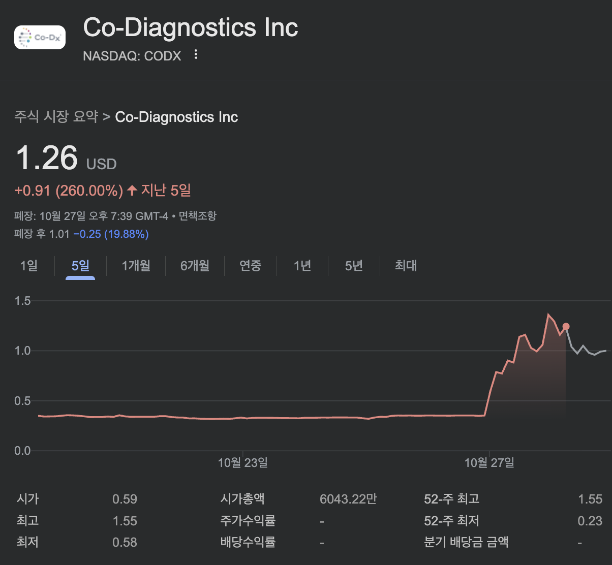 코 다이어그노스틱스 (CODX) 주식은 10월 27일(현지시간) 장중 259.28% 상승하며 1.26달러로 마감했습니다. 이는 프리마켓에서 이미 150% 이상 뛴 데 이어 거래 중 추가 랠리를 더한 결과로, 거래량이 평소 대비 20배 이상 폭증하며 '볼륨 익스플로전'을 기록했습니다.