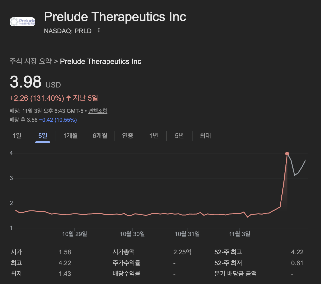 프렐류드 테라퓨틱스 (PRLD) 주식은 10월 30일(현지시간) 장중 150.31% 상승하며 3.98달러로 마감했습니다. 이는 프리마켓에서 이미 100% 이상 뛴 데 이어 거래 중 추가 랠리를 더한 결과로, 거래량이 평소 대비 20배 이상 폭증하며 '볼륨 익스플로전'을 기록했습니다.