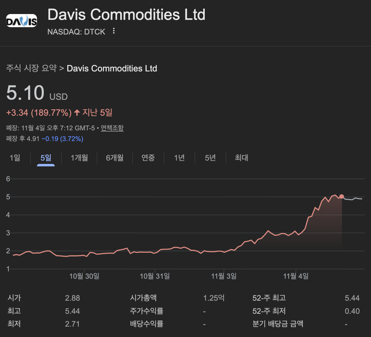 데이비스 커모더티스 (DTCK) 주식은 11월 4일(현지시간) 장중 63.46% 상승하며 5.1달러로 마감했습니다. 프리마켓에서 이미 40% 이상 뛴 데 이어 거래 중에도 상승세를 이어갔고, 거래량이 평소 대비 15배 이상 폭증하며 시장의 뜨거운 관심을 증명했습니다.