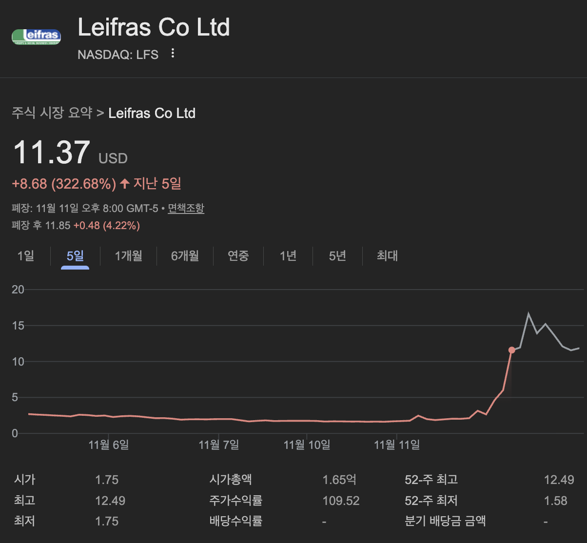 - 성공적인 IPO 데뷔: Leifras는 2025년 10월 9일 Nasdaq에 상장하며 1,250,000 주를 $4에 발행해 $5M 조달했습니다. 이는 초기 계획을 초과한 규모로, 투자자들의 높은 관심을 보여줍니다. 상장 후 주가가 576% 폭등하며 $1.68 이전 종가에서 $11.37로 급등.