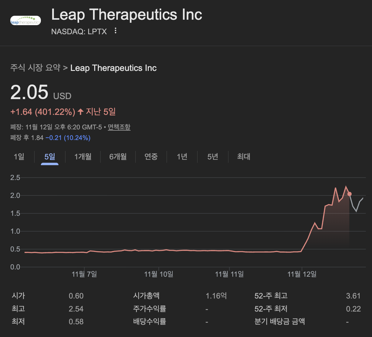 LPTX 주가는 이전 종가에서 하루 만에 $2.05로 치솟았습니다. 거래량은 평소 평균을 훌쩍 뛰어넘어 폭발적이었으며, 이는 시장의 극심한 관심을 반영합니다. 주요 상승 요인은 다음과 같아요: