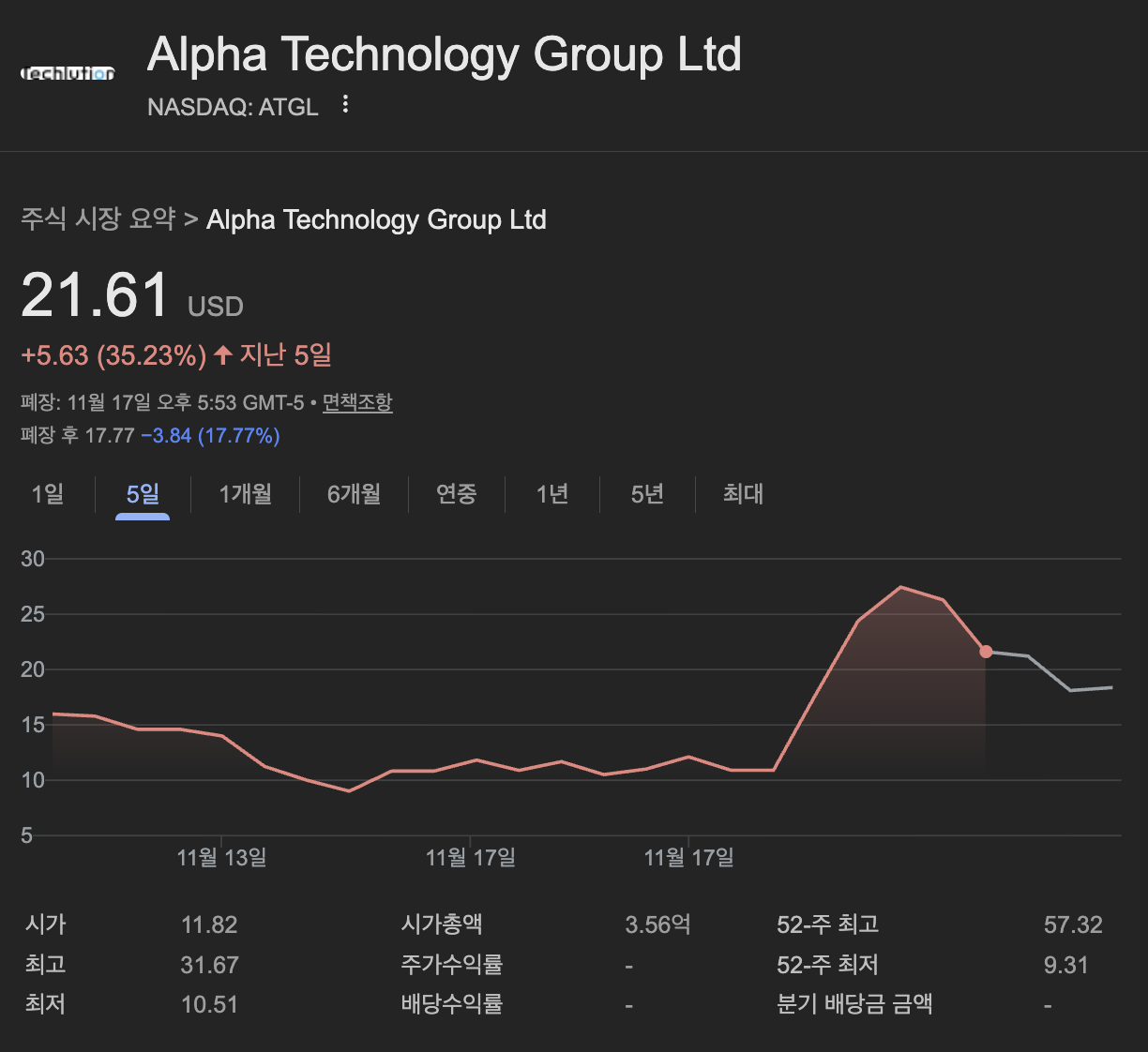 Alpha Technology Group Ltd. (티커: ATGL)는 2013년 설립된 홍콩 기반 회사로, AI·클라우드 컴퓨팅 서비스 제공 전문. 주요 사업: Alphacloud 플랫폼으로 데이터 관리, AI 솔루션, 보안 서비스.