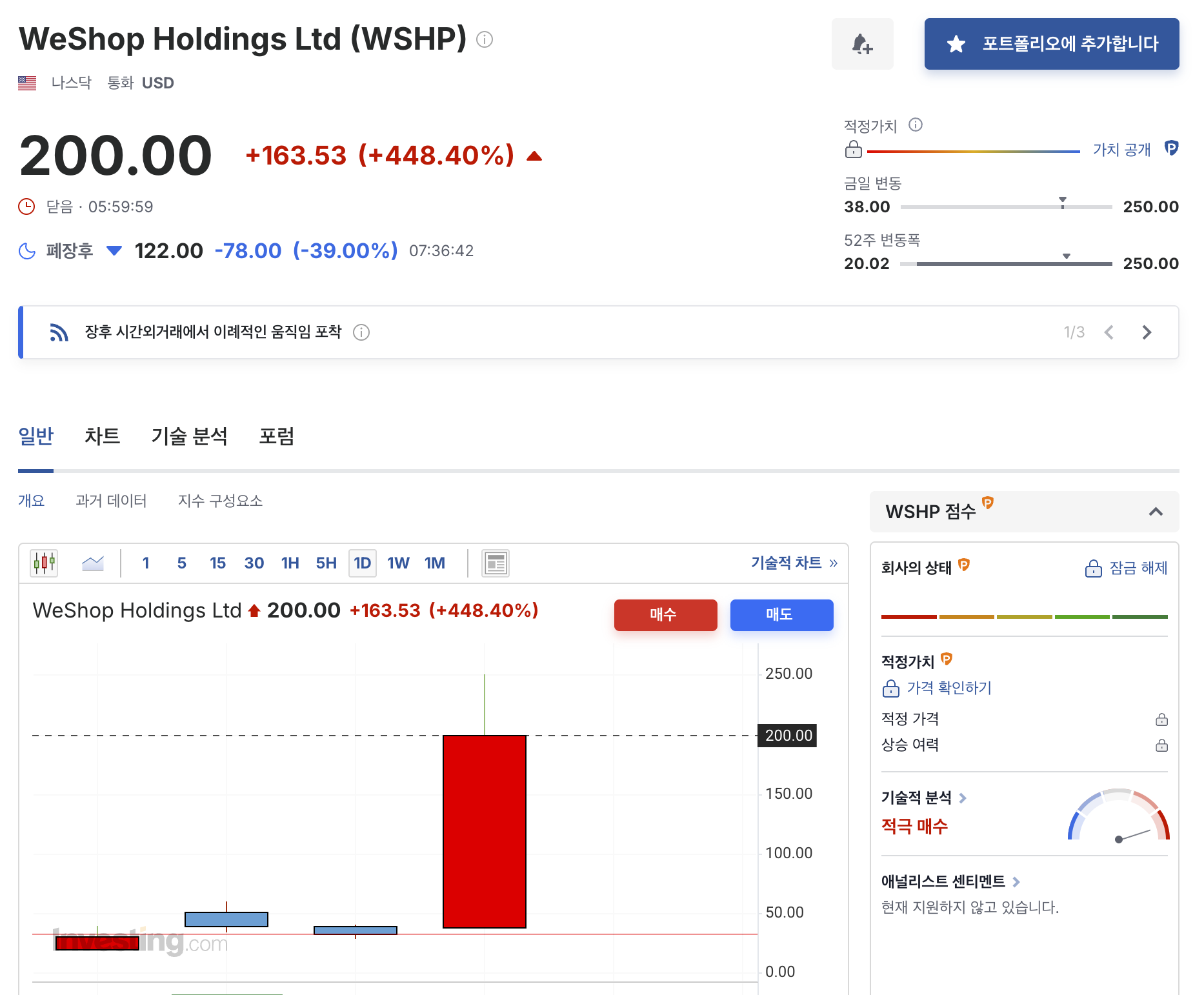 오늘은 특별히 주목받은 WSHP (WeShop Holdings Limited) 주식에 대해 이야기해보려 합니다. 어제 미국 시장에서 WSHP 주가가 무려 506.06% 상승하며 $200로 마감했습니다. 이는 IPO 데뷔의 전형적인 성공 사례로, social e-commerce 시장 수요 증가와 강한 재무 성과가 투자자들의 뜨거운 관심을 모은 결과입니다. 상승 이유부터 기업 분석, 그리고 앞으로의 전망까지 자세히 짚어보겠습니다. 모든 데이터는 Yahoo Finance와 신뢰할 수 있는 소스에서 확인한 최신 정보입니다.