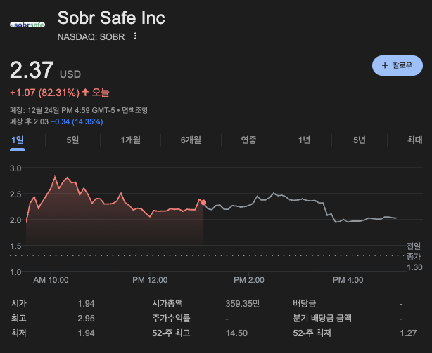 오늘 시장에서 가장 극적인 반전을 보여준 종목은 **소버 세이프(Ticker: SOBR)**입니다. 주가가 전일 대비 +82.31% 치솟으며 $2.37로 마감했습니다. 이 회사는 최근까지 주가가 1달러 선을 위협받으며 상장 폐지와 파산의 공포에 시달렸습니다. 하지만 크리스마스 이브에 터진 '200만 달러 자금 조달' 뉴스가 시장의 분위기를 180도 바꿔놓았습니다.