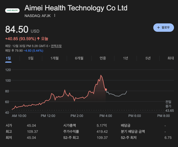2025년 12월 31일, 올해의 마지막 거래일을 앞두고 시장을 충격에 빠뜨린 종목은 단연 **아이메이 헬스(Ticker: AFJK)**입니다. 전일 대비 **+89.19%**라는 비현실적인 상승률을 기록하며 주당 $82.58에 마감했습니다. 장중 변동성은 상상을 초월했습니다. 이 주식은 현재 **'이유 없는 폭등'**의 교과서적인 모습을 보여주고 있습니다. 기업의 가치가 하루 만에 2배가 된 것이 아니라, '주식이 없어서' 가격이 치솟는 현상입니다.