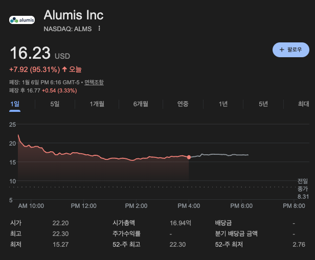 1월 6일(현지 시간), 시장의 주인공은 단연 **알루미스(Ticker: ALMS)**였습니다. 장중 한때 $22.30까지 치솟았던 주가는 전일 대비 +95.31% 상승한 $16.23로 마감했습니다. 바이오 투자자들이 가장 기다려온 순간, 바로 '임상 3상 성공' 뉴스가 터지며 공매도 세력을 궤멸시키는 강력한 숏 스퀴즈와 매수세가 유입되었습니다.
