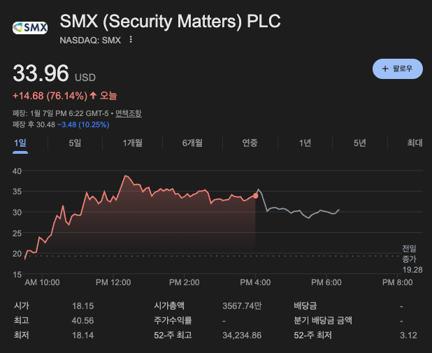 1월 8일 목요일, 시장의 이목을 집중시킨 종목은 단연 **SMX(Ticker: SMX)**입니다. 장중 변동성이 극에 달하며 전일 대비 +76.14% 상승한 $33.96로 마감했습니다. 작년 한 해 동안 주가가 99% 하락하며 주주들에게 절망을 안겨주었던 이 주식이, 새해 들어 **"자금 걱정 없다"**는 뉴스와 함께 무서운 속도로 숏 스퀴즈(Short Squeeze)를 연출하고 있습니다.