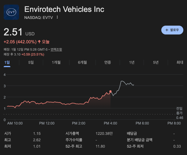 1월 12일 월요일, 나스닥 시장을 그야말로 뒤집어 놓은 종목이 등장했습니다. **인바이로테크 비히클스(Ticker: EVTV)**가 전일 대비 **+442.00%**라는 경이로운 상승률을 기록하며 $2.51로 마감했습니다. $0.40~0.50불 대에서 거래되던 '동전주'가 단숨에 2.5달러를 돌파한 배경. 죽어가던 전기차 회사가 **'Azio AI'**라는 새로운 엔진을 달고 부활을 선언했기 때문입니다.