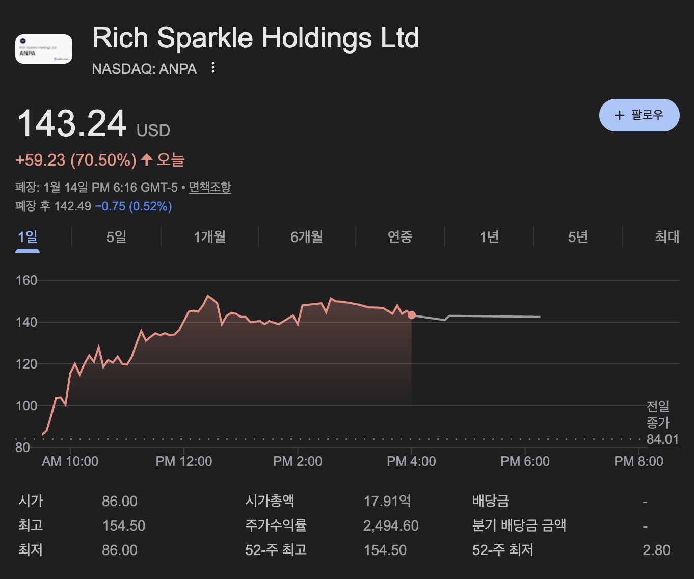 1월 15일 목요일, 시장의 이목은 나스닥에 갓 입성한 신규 상장주(IPO)에 쏠렸습니다. **리치 스파클 홀딩스(Ticker: ANPA)**가 거래 시작과 동시에 폭등 랠리를 펼치며 $143.24로 마감했습니다. 상장하자마자 시가총액이 수조 원대로 불어난 이 기업. 도대체 무엇을 파는 회사길래 시장이 이렇게 열광(혹은 광기)하는 걸까요?