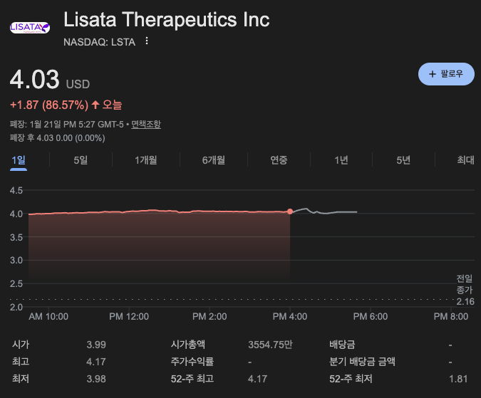 1월 22일 목요일, 어제 바이오 시장의 스포트라이트는 **러사타 테라퓨틱스(Ticker: LSTA)**에 쏟아졌습니다. 전일 $2.10 수준이던 주가가 거래량 폭발과 함께 +86.57% 상승한 $4.03로 장을 마쳤습니다. 최근 주가 부진을 씻어내고 단숨에 4달러 고지를 점령한 배경에는, 바이오 기업에게는 '로또'와도 같은 FDA의 특별 지정 뉴스가 있었습니다.