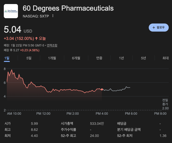 1월 23일 금요일, 어제 바이오 섹터의 주인공은 단연 **60 디그리스 파머슈티컬스(Ticker: SXTP)**였습니다. 전일 대비 +152.00% 상승한 $5.04로 장을 마쳤습니다. 불과 며칠 전 1대 4 주식 병합을 단행하며 힘겨워하던 주가가, 하루아침에 2.5배 넘게 뛴 상황. 이유는 **"접근성의 혁명"**입니다. 해외 여행객들이 가장 번거로워하는 '말라리아 약 처방'을 온라인으로 해결해 주는 길이 열렸기 때문입니다.