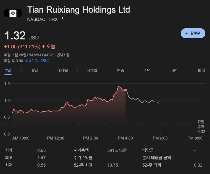 1월 29일 목요일, 어제 시장은 조용했지만 소형주 섹터에서는 **티엔 루이시앙 홀딩스(Ticker: TIRX)**가 그야말로 '미친 존재감'을 뿜어냈습니다. 전일 $0.32에 불과했던 주가가 장중 내내 폭주하며 +311.21% 상승한 $1.32로 마감했습니다. 망해가던 회사가 갑자기 부활한 이유, 바로 **"구원 투수(SwiftStart)"**가 등장했기 때문입니다.
