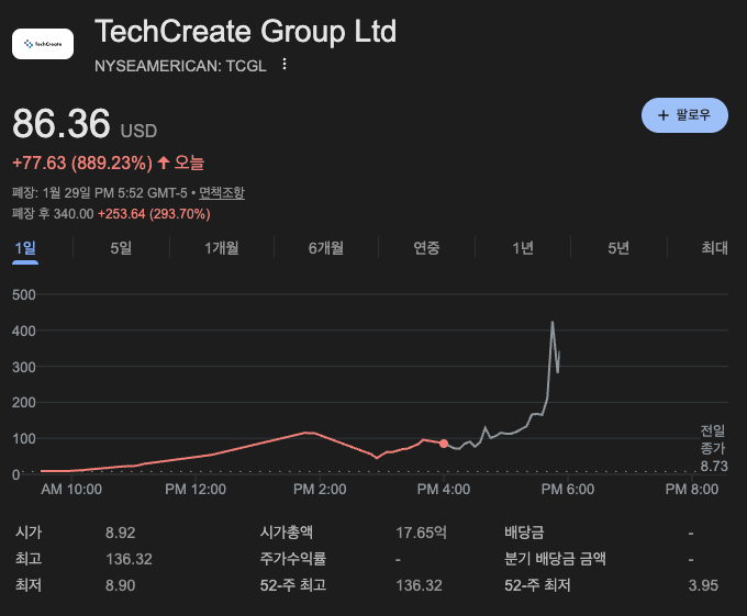 결론: 테크크리에이트(TCGL)의 889% 폭등은 **"AI 키워드"**와 **"품절주 수급"**이 빚어낸 거대한 머니 게임입니다. 기업의 기술력이 나쁘다는 뜻은 아니지만, 현재 시가총액은 매출 규모 대비 설명이 불가능한 수준입니다. 지금 진입하는 것은 투자가 아니라 도박입니다. 기존 보유자라면 '로또 당첨'과 같은 수익을 즉시 확정 짓고, 신규 진입은 절대 삼가시기 바랍니다.
