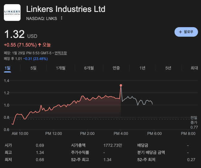 1월 30일 금요일, 소형주 시장의 주인공은 어제에 이어 또다시 **링커스 글로벌(Ticker: LNKS)**이었습니다. 어제 60% 상승에 이어 오늘 +71.50% 추가 급등하며 $1.31로 장을 마쳤습니다. 동전주(Penny Stock)의 설움을 씻고 지폐주($1.00 이상)로 복귀한 링커스. 왜 시장은 이 종목을 1달러 위로 올려놓았을까요?