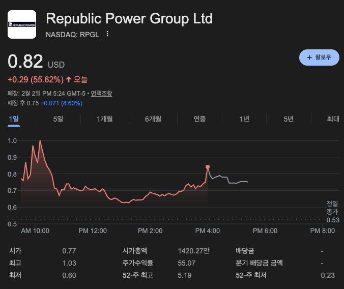 2월 3일 화요일, 어제(현지 2일) 미국 증시 소형주 섹터에서 가장 치열한 공방전이 벌어진 종목은 **리퍼블릭 파워 그룹(Ticker: RPGL)**이었습니다. 전일(금요일) 종가 $0.528에서 출발해 +59.09% 상승한 $0.84로 마감했습니다. 주목할 점은 장중 고점이 $1.03였다는 것입니다. 1달러 위로 올라서는 순간 쏟아진 매물 폭탄. 과연 이 회사는 나스닥에서 살아남을 수 있을까요?