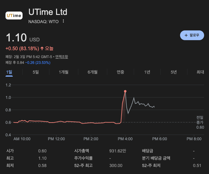 2월 4일 수요일, 소형주 섹터의 투기 열풍이 식지 않고 있습니다. 오늘의 급등주는 **유타임(Ticker: WTO)**입니다. 전일 $0.60 수준이었던 주가가 장중 거래량이 실리며 +83.18% 상승, $1.10로 마감했습니다. 상장 이후 줄곧 하락세만 걷던 이 회사가 갑자기 급등한 이유, 실적이 좋아서일까요? 아닙니다. **"살아남기 위해서"**입니다.