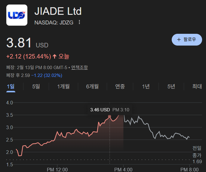 월 16일 월요일, 나스닥 전광판에서 가장 화려하게 빛났던 종목은 **자더(Ticker: JDZG)**였습니다. 장중 무려 125% 이상 솟구치며 $3.00 선을 단숨에 돌파한 이 기업의 동력을 파헤쳐 보겠습니다.