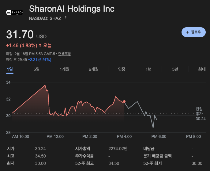 - 나스닥 기업공개(IPO) 성공: 샤론AI는 2월 18일(현지시간), 주당 $30.00의 가격으로 총 1억 2,500만 달러 규모의 IPO 가격을 책정하며 나스닥 캡마켓(Nasdaq Capital Market)에 입성했습니다.