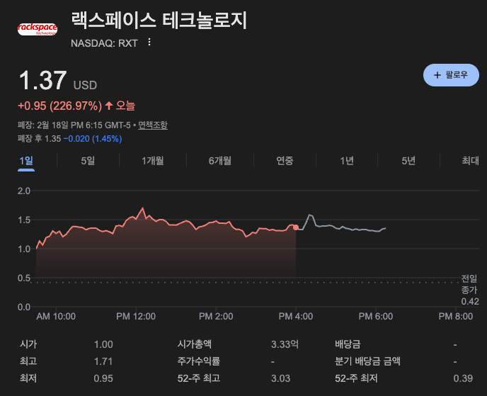 2월 19일 목요일 아침, 나스닥 전광판에는 비현실적인 숫자가 찍혔습니다. 52주 최저가($0.393) 부근에서 허덕이던 **랙스페이스(Ticker: RXT)**가 단숨에 $1.37로 날아올랐습니다. 단순한 기술적 반등이 아닌, 기업의 비즈니스 모델 자체가 '돈이 되는 AI'로 전환되었다는 평가가 지배적입니다.