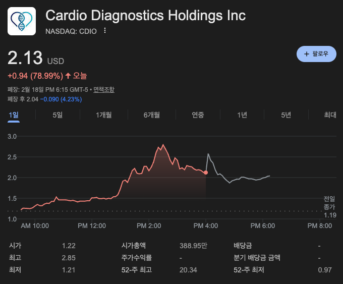2월 19일 목요일, 나스닥 소형주 섹터에서 기록적인 '불기둥'이 포착되었습니다. 주인공은 **카디오 다이어그노스틱스(Ticker: CDIO)**입니다. 어제까지 $1.20 선을 맴돌던 주가가 단숨에 $2.13로 점프하며 거래량이 폭발했습니다. 단순한 투기가 아닌, '실체 있는 데이터'가 만든 이번 랠리의 내막을 파헤쳐 보겠습니다.