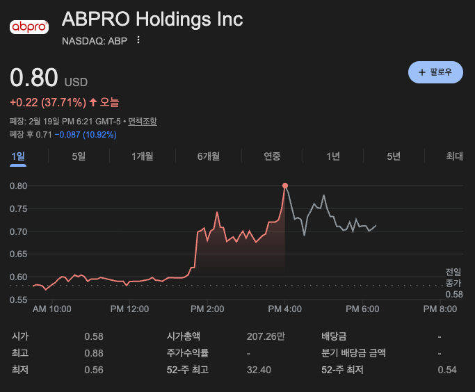 2월 20일 금요일 아침, 나스닥 전광판에서 눈에 띄는 숫자는 **37.71%**입니다. 최근 1년간 주가가 97% 넘게 하락하며 '사망 선고'가 임박해 보였던 **에이비프로(Ticker: ABP)**가 강력한 거래량을 동반하며 반등의 신호탄을 쏘아 올렸습니다. 단순한 기술적 반등일까요, 아니면 본질적인 체질 개선의 시작일까요? 그 내막을 파헤쳐 보겠습니다.