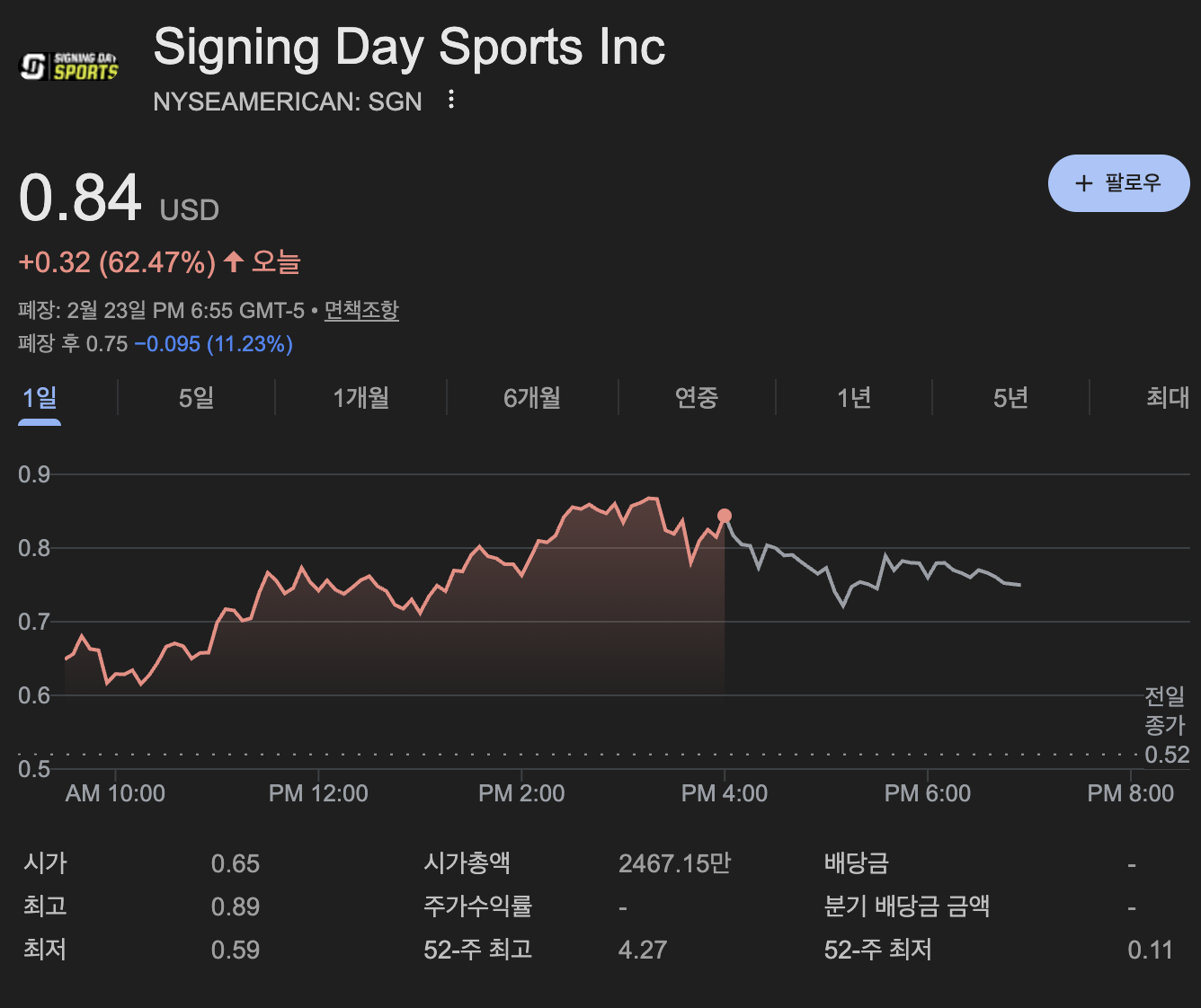 결론: 사이닝 데이 스포츠(SGN)의 62% 폭등은 **"AI라는 새로운 심장을 이식받기 직전의 설렘"**이 만든 시세입니다.