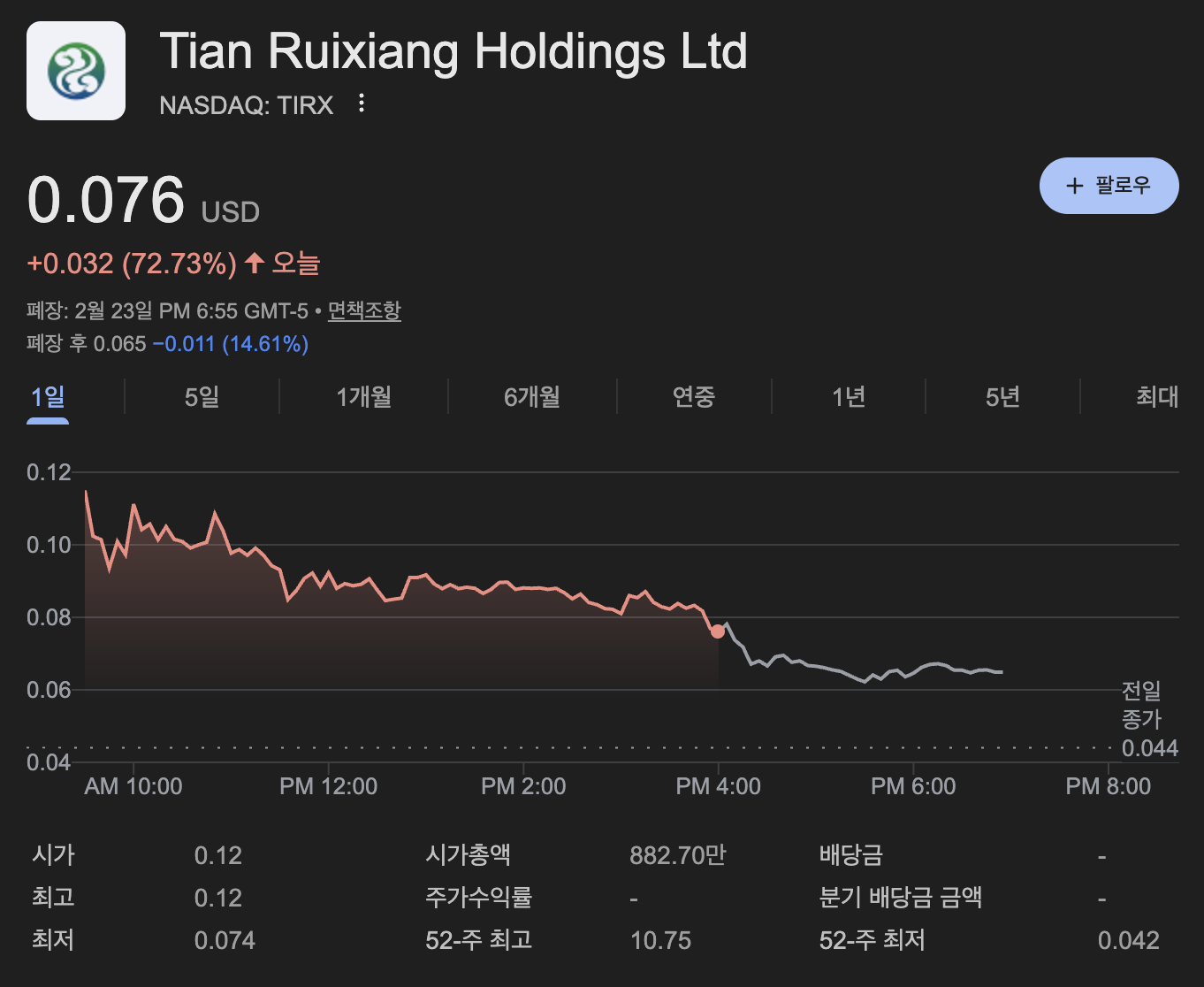 2월 24일 화요일, 나스닥 소형주 섹터에서 기록적인 'V자 반등'이 포착되었습니다. 주인공은 **티엔 루이시앙(Ticker: TIRX)**입니다. 최근 1년간 주가가 98% 넘게 하락하며 상장 폐지 위기까지 몰렸던 이 기업이 어떻게 '상상 초월'의 반전 카드를 꺼내 들었는지 파헤쳐 보겠습니다.