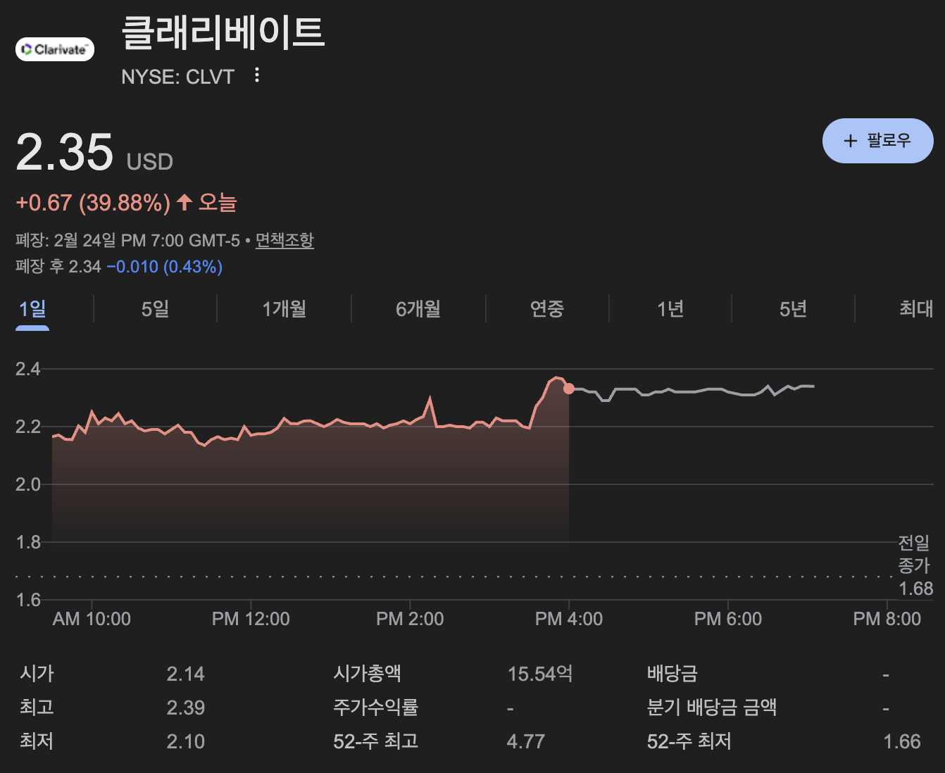 2월 25일 수요일, 나스닥 전광판에서 가장 화려한 'V자 반등'을 그려낸 종목은 **클래리베이트(Ticker: CLVT)**였습니다. 단순히 지수를 따라가는 반등이 아닌, 기업의 체질 개선 의지가 숫자로 증명된 하루였는데요. 그 구체적인 이유를 파헤쳐 보겠습니다.