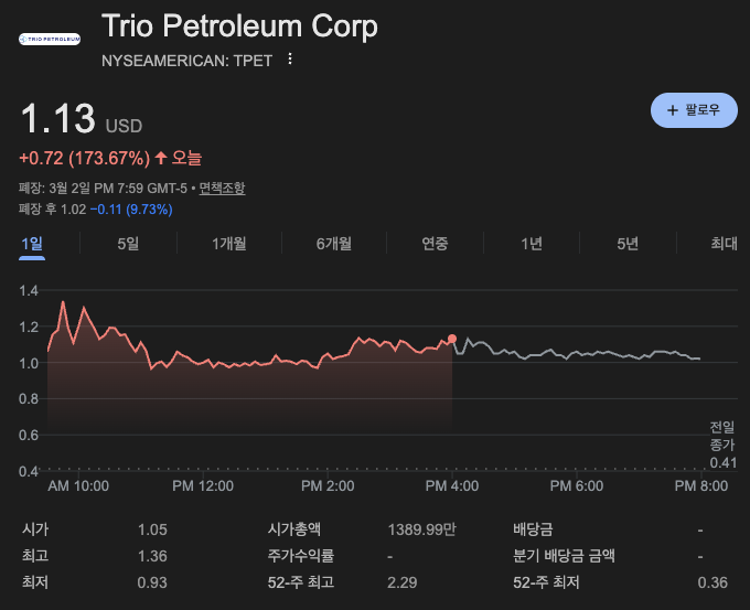 결론: 트리오 페트롤리엄(TPET)의 이번 폭등은 **"전쟁이라는 비극이 소형 에너지주에게는 가장 강력한 기폭제가 된 결과"**입니다.