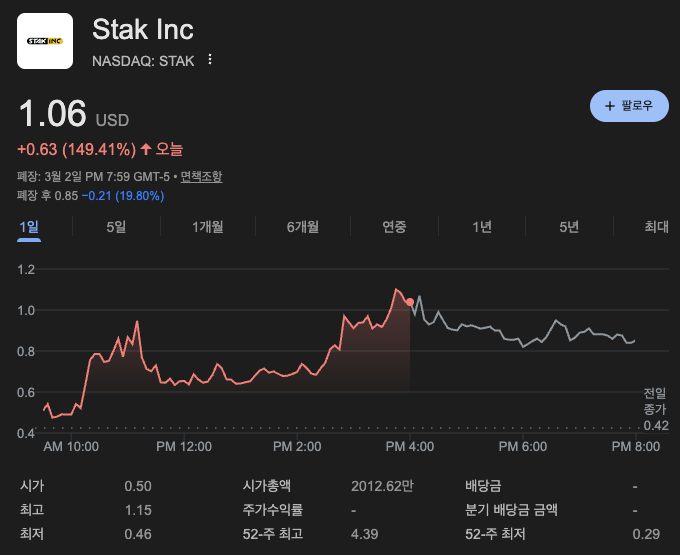 3월 3일 화요일, 나스닥 소형주 섹터에서 가장 뜨거운 '오브제(Objet)'는 단연 **스택(Ticker: STAK)**이었습니다. 지난 2월 초 $0.29라는 역대 최저점을 찍었던 주가가 한 달 만에 3배 이상 뛰어오르며 $1 고지를 탈환했는데요. 그 내막을 파헤쳐 보겠습니다.