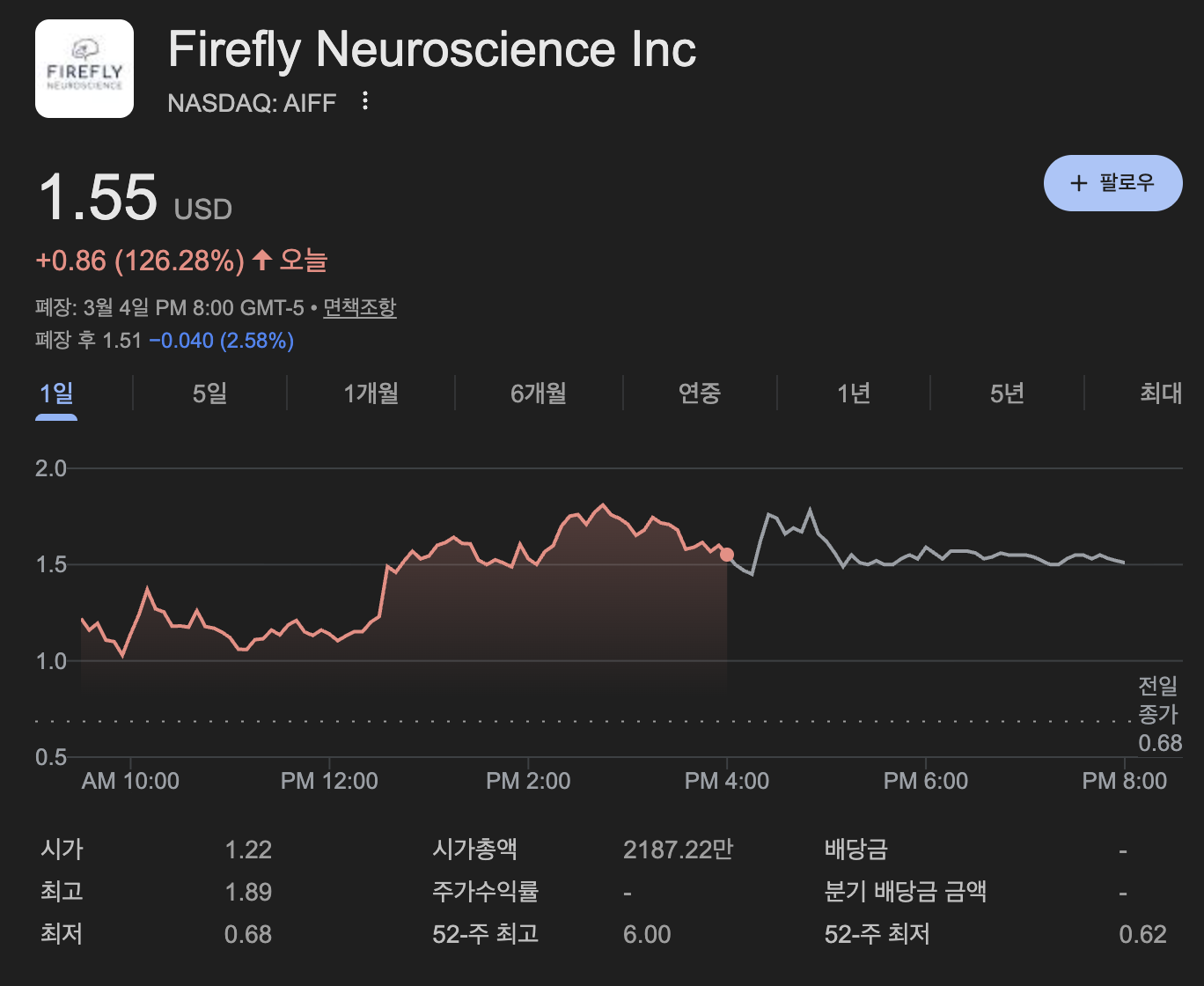 결론: 파이어플라이 뉴로사이언스(AIFF)의 이번 폭등은 **"AI 기술이 의료 현장의 실질적인 데이터(33배 성장)와 만났을 때 어떤 파괴력을 내는지 보여준 결과"**입니다.