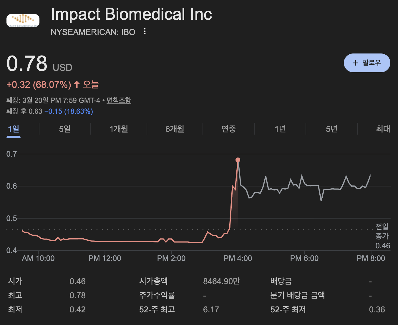 한국 시간 3월 23일 월요일입니다. 지난 주말 뉴욕 증시가 전반적인 하방 압력을 받는 와중에도, 나노캡 바이오테크 섹터에서 경이로운 수직 상승을 기록한 종목이 있습니다. 혁신적인 헬스케어 솔루션과 특허 기술을 보유한 **임팩트 바이오메디컬(Impact BioMedical, Ticker: IBO)**이 그 주인공입니다. 현지 시간 3월 20일 종가 기준, IBO 주가는 전일 대비 +68.47% 폭등하며 0.78달러에 안착했습니다. 최근 지지부진했던 흐름을 단번에 깨뜨린 이번 급등의 배경과 기업 분석, 그리고 향후 전망을 정밀 분석해 드립니다. 🚀