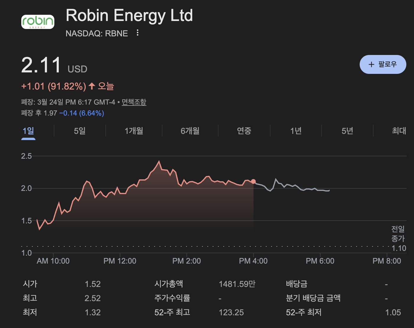 | 마감 주가 | 2.11달러 (전일 대비 +91.82%) 📈 |