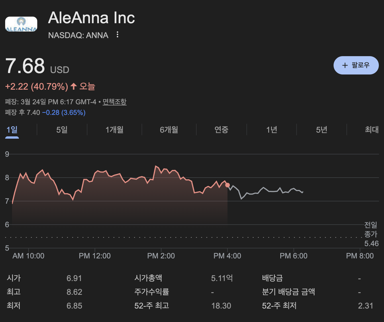 한국 시간 3월 25일 수요일입니다. 지난밤 뉴욕 증시가 전반적인 혼조세를 보인 가운데, 에너지 섹터에서는 **알레안나(AleAnna, Inc., Ticker: ANNA)**가 다시 한번 기록적인 랠리를 펼쳤습니다. 지난주 87% 폭등에 이어 이번에도 40% 넘는 상승세를 기록하며 시장의 주인공이 되었습니다. 전일 대비 +40.79% 폭등하며 7.68달러에 마감한 ANNA의 급등 배경과 기업 분석, 그리고 향후 전망을 정밀 분석해 드립니다. 🚀