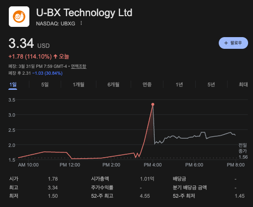 한국 시간 4월 1일 수요일 아침입니다. 3월 한 달간 지정학적 리스크와 유가 폭등으로 고통받던 뉴욕 증시가 마지막 거래일(현지시간 31일)에 그야말로 **'역대급 반전'**을 기록했습니다. 그중에서도 가장 뜨거운 시선을 한 몸에 받은 종목은 중국의 인슈어테크(Insurtech) 강자, **U-BX 테크놀로지(U-BX Technology Ltd., Ticker: UBXG)**였습니다. 전일 대비 **+112.63%**라는 경이로운 폭등을 기록하며 3.34달러에 마감한 UBXG의 급등 배경과 기업 분석, 그리고 향후 전망을 정밀 분석해 드립니다. 🚀