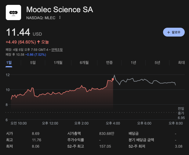 한국 시간 2026년 4월 7일, 오늘 나스닥 시장에서 가장 경이로운 상승 곡선을 그린 종목은 단연 **물렉 사이언스(Moolec Science, Ticker: MLEC)**입니다. "식물을 바이오 리액터(Bioreactor)로 사용한다"는 파격적인 비전이 마침내 숫자로 증명되며 시장을 뒤흔들고 있습니다. 전일 대비 **+64.60%**라는 폭발적인 상승률을 기록하며 11.44달러에 마감한 MLEC의 급등 배경과 기업 분석, 그리고 향후 전망을 정밀 분석해 드립니다. 🚀