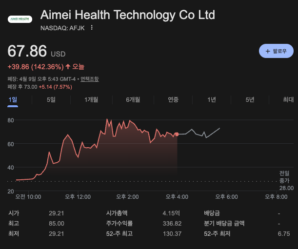 한국 시간 4월 10일 금요일 아침, 나스닥 시장에서 어제에 이어 또 한 번의 경이로운 랠리가 펼쳐졌습니다. 스팩(SPAC) 종목인 **아이메이 헬스 테크놀로지(Aimei Health Technology, Ticker: AFJK)**가 전일 대비 **+142.36%**라는 기록적인 폭등을 보이며 67.86달러에 마감했습니다. 어제 유닛(Unit) 종목인 AFJKU가 170% 이상 급등한 데 이어, 오늘은 보통주인 AFJK가 바통을 이어받아 폭발적인 수급을 보여주었습니다. 이 놀라운 상승의 배경과 기업의 실체, 그리고 향후 전망을 정밀 분석해 드립니다. 🚀