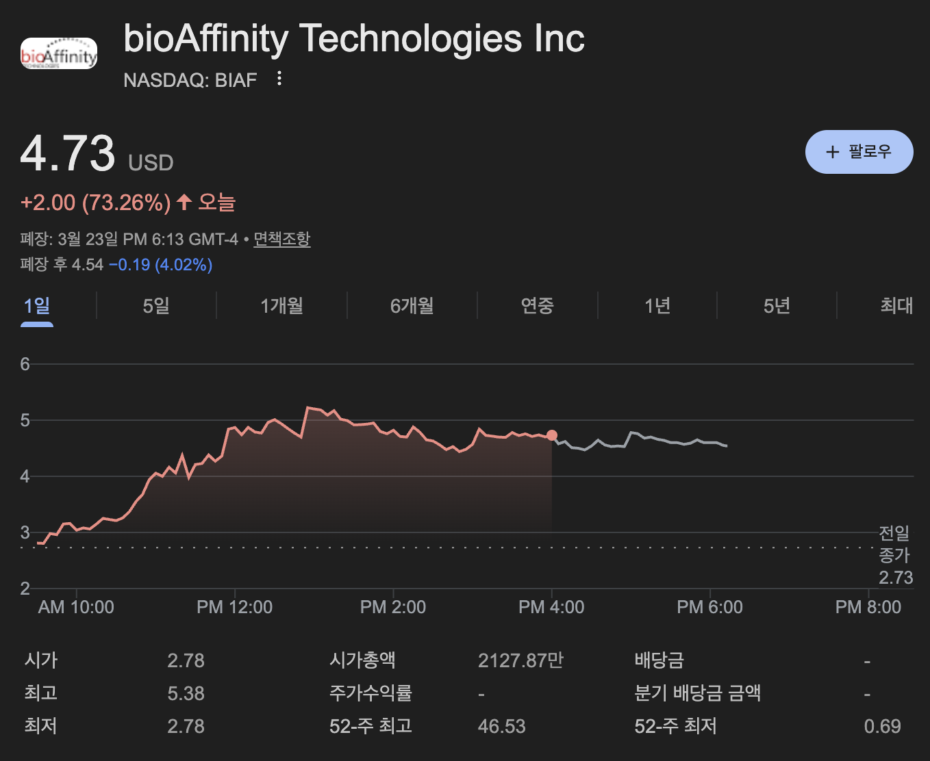 안녕하세요, 경제 및 투자 전략 전문 블로그 Quantum Asset입니다.한국 시간 3월 24일 화요일입니다. 지난밤 뉴욕 증시에서 바이오테크 섹터의 초소형주 하나가 시장의 모든 이목을 집중시켰습니다. 폐암 조기 진단 시장의 '게임 체인저'로 불리는 **바이오어피니티 테크놀로지스(bioAffinity Technologies, Ticker: BIAF)**가 그 주인공입니다. 전 거래일 대비 **+73.26%**라는 기록적인 폭등을 기록하며 4.73달러에 마감한 BIAF의 급등 배경과 기업 분석, 그리고 향후 전망을 정밀 분석해 드립니다. 🚀 📉 오늘의 주요 지표 한눈에 보기항목상세 내용종목명 / 티커바이오어피니티 테크놀로지스 / BIAF마감 주가4.73달러 (전일 대비 +73.26%) 📈거래량평소..