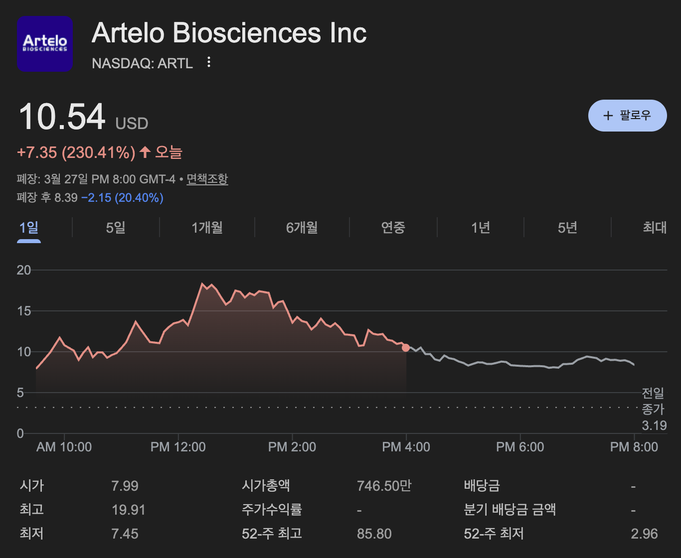 안녕하세요, 경제 및 투자 전략 전문 블로그 Quantum Asset입니다.한국 시간 3월 30일 월요일입니다. 최근 뉴욕 증시가 지정학적 리스크로 인해 '조정장'에 진입하며 대다수 종목이 하락세를 보이는 가운데, 바이오테크 섹터에서 경이로운 '디커플링'을 보여준 종목이 있습니다. 지질 신호 전달 경로(Lipid-signaling) 조절 기술을 보유한 **아르텔로 바이오사이언시스(Artelo Biosciences, Ticker: ARTL)**가 그 주인공입니다. 전일 대비 **+230.41%**라는 기록적인 폭등을 기록하며 10.54달러에 안착한 ARTL의 급등 배경과 기업 분석, 그리고 향후 전망을 정밀 분석해 드립니다. 🚀 📉 오늘의 주요 지표 한눈에 보기항목상세 내용종목명 / 티커아르텔로 바이..